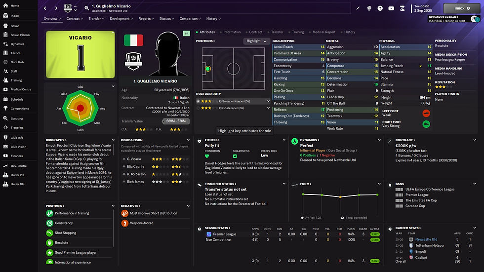 We then stick with Tottenham as their disappointing season meant they had a few players that could be persuaded to move on, and with us wanting to improve our goalkeeper position, we spent £53,000,000 to lure Guglielmo Vicario away from them. He comes in as our clear number 1 for the next couple of seasons and then depending on the development of our young keepers we will see where we stand with him as he hits the 30's. The thing that made me decide he was the one for me was that he had 13 clean sheets in the Premier League last season despite Spurs finishing down in the bottom half of the league, compared to our keepers who had been leaking goals and keeping those clean sheets was a big factor in our disappointing league campaign.